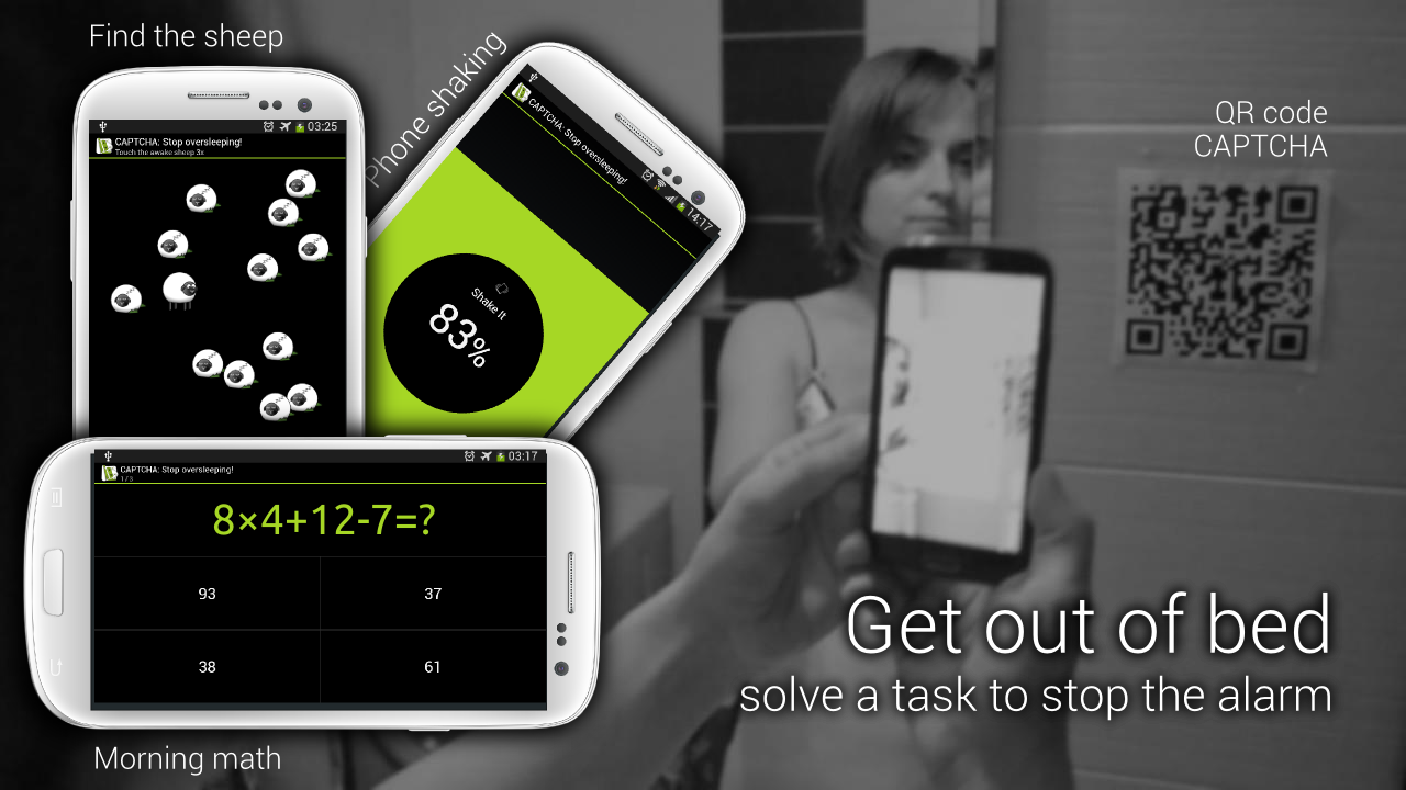 - Never oversleep again with CAPTCHA wake up verification (Math, Sheep counting, Phone shaking, Bathroom QR code or NFC tag)